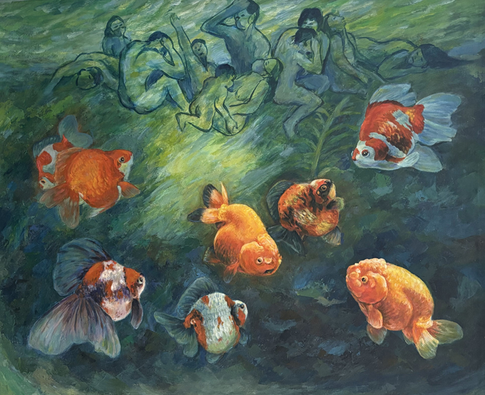 而画面下方,几尾橙红色金鱼,悠然自得地游弋,色彩明亮,姿态从容。它们无声,却自在;无知,却不惧。金鱼的安然,与人类的慌乱,形成强烈对比,也发人深省。
