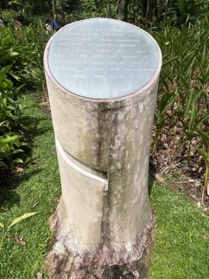 两周前,我特地去新加坡植物园寻找第一代橡胶树,遗憾,一棵都不存了。不过,我们知道新加坡植物园第一代11株橡胶树种植位置大约在植物园交响乐湖(Symphony lake)附近,园方还特地为这11棵“祖先”设了一个纪念碑,形状是一个橡胶树桩,大约一公尺高。幸运的是,我之前看《星洲日报》,得知霹雳州江沙还保存了一棵第一代橡胶树,它也是马新两地现存唯一一棵第一代橡胶树。