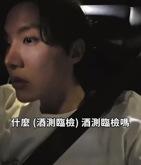直播到一半,车窗却突然降了下来,司机表示:“载艺人。”车窗外的人回应:“艺人?可以了喔!来。”J-Hope眼睛睁超大,四处张望,惊讶地说:“什么,酒测临检吗?原来这里也有酒测临检,好神奇啊。”
