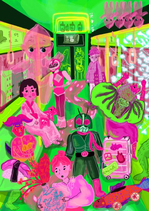 萤光城市的电车里,多多鱼买了机票去看电子花;松本小姐买了粉红色的玩具狗;胜熙小姐买了万鹤祝寿花瓶;蛇仔明买了大型寿司(除了可以陪他坐电车之外,没什么用处了)。