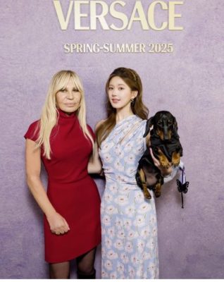 Versace全品牌代言人赵露思带上宠物狗,一同“应邀”出席2025年春夏季米兰时装周的Versace时装秀,并与刚卸任创意总监一职后成为Versace首席品牌大使的Donatella Versace(左)合影。( 图取自IG@donatella_versace)