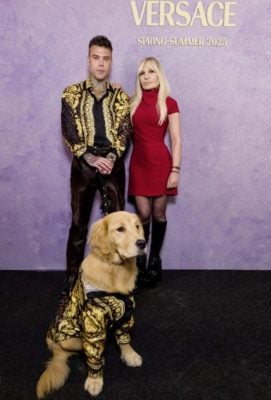 在2025年春夏季米兰时装周上,带着宠物一起亮相的艺人,除了赵露思外还有意大利说唱歌手,两人的宠物皆穿上了Versace新一季的宠物系列亮相。赵露思的爱狗穿的是深色调的设计,或许远距离下还未能一眼就辨认出来。而Fedez的宠物则是穿上了和他同款,带Versace经典标识的巴洛克风格设计,叫人立马就可看出这是品牌的杰作。