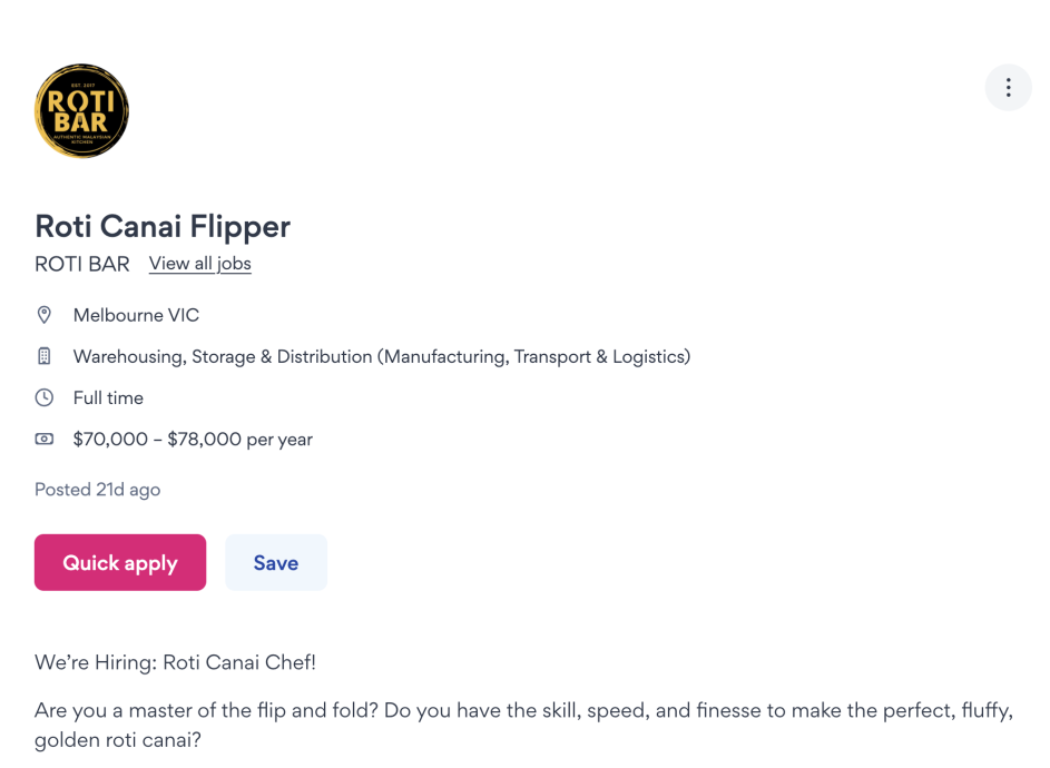 这份全职工作由墨尔本一家主打马来街头美食的餐厅“Roti Bar”发布,年薪介于7万至7万8000澳元,约合马币22万至24万5000令吉。