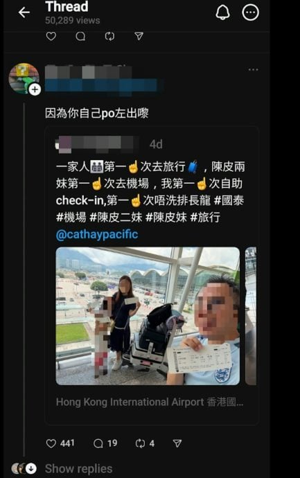 不过,有网民很快在帖文下留言指出原因,因为男子在出发前曾晒出一家四口在登机柜台前的自拍照,清晰显示4人手持登机证的画面,连条码、航班日期、时间、座位编号等资料一览无遗。