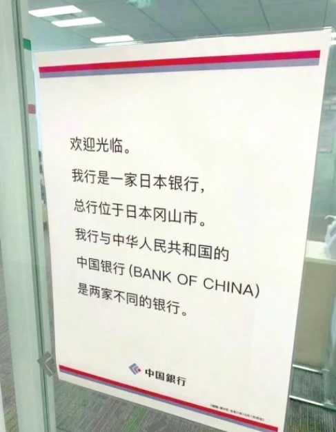 日本这家银行的日文名字——“中国银行”,和总部北京的中国这家银行的中文名字,如果不考虑繁体简体因素的话,简直一模一样。无怪乎会令一些来日本的中国游客张冠李戴。