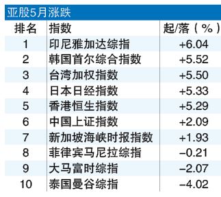 相较之下,印尼雅加达综指表现最为强劲,5月劲扬6.04%;台湾加权指数以5.5%涨幅居次,韩国首尔综指亦大涨5.52%。日本日经指数与香港恒生指数则分别上涨5.33%与5.29%,均录得超过5%的可观涨幅。