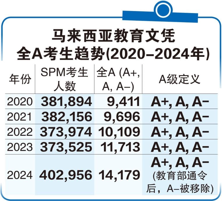 更让人不解的是,教育总监阿兹曼阿德南于4月24日在公布2024年大马教育文凭成绩的记者会上,同样把A-与A+和A一起归类为“特优”。