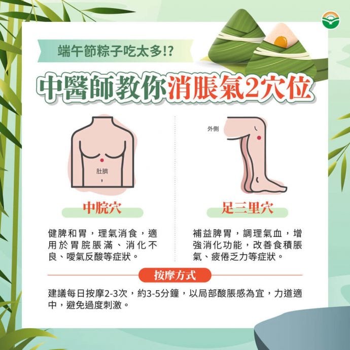 (台北31日综合电)端午佳节吃粽子,但其原料糯米与肥肉却可能导致腹胀。中医师提醒,除了要细嚼慢咽,也可按摩中脘穴、足三里穴,或饮用山楂陈皮乌梅茶、麦芽神曲茶,搭配饭后散步缓解胀气。