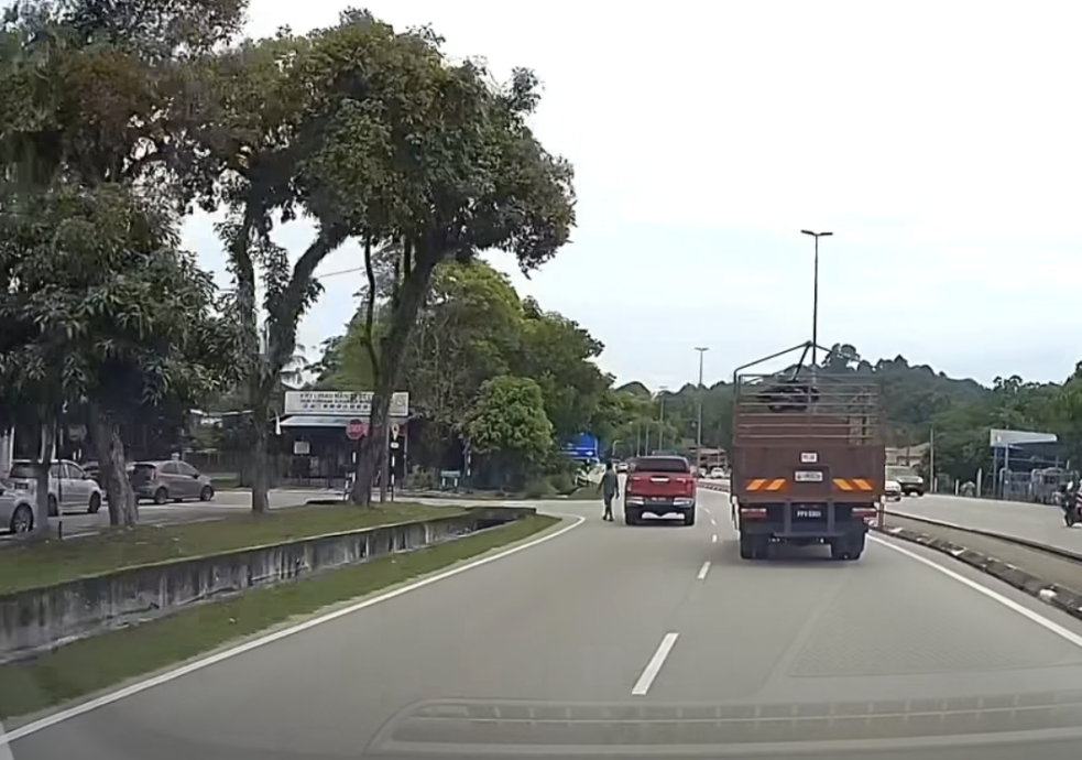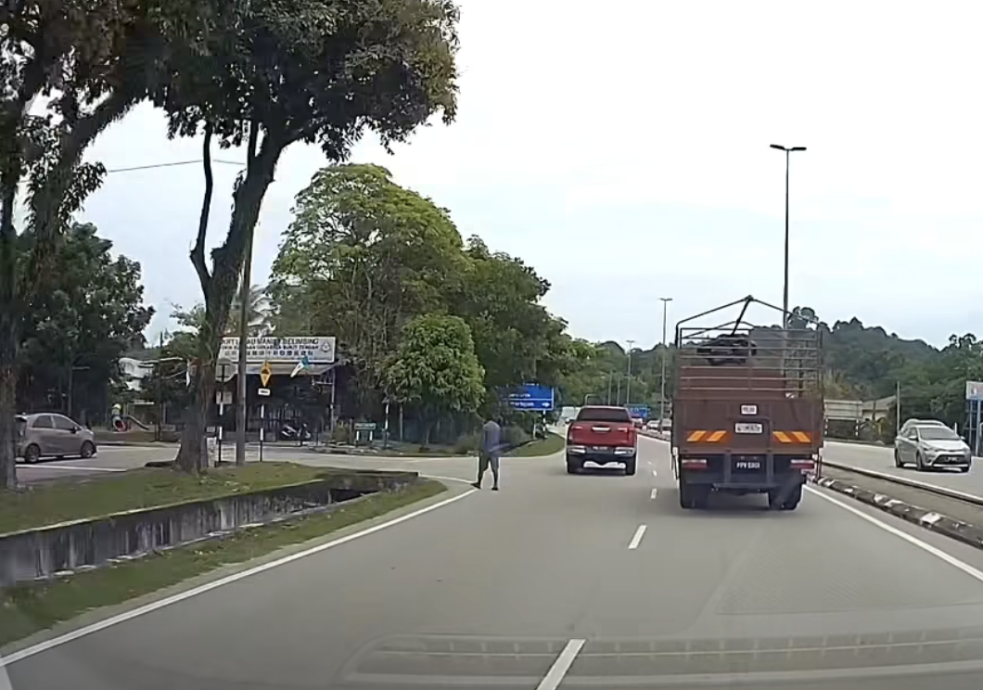 这起事件发生在5月30日下午1时许,据了解,事发地点位于槟城某条公路上。当时车辆正在正常行驶,前方道路空无一人,下一秒却突现一名身穿灰衣的男子越过马路。