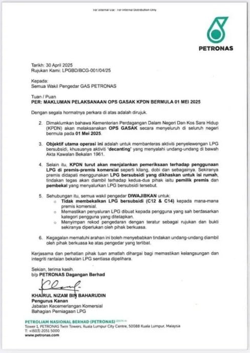 第二, 信函内容明确提出,“严打行动”的主要目标是打击非法“倒灌”(decanting)受津贴煤气,转售牟利的非法行为。这种活动,不能排除可能会有餐饮业的害群之马参与其中。所以国油如果告知经销商,售卖给餐馆就一定不会触犯法律,恐怕也未必准确。