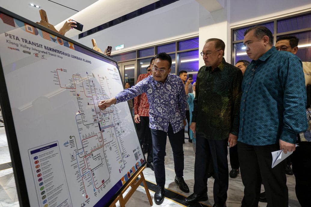 陆兆福(右起)和安华出席昌明马来西亚学术论坛系列六时,聆听基建公司主席兼首席执行员莫哈末阿兹哈鲁丁介绍巴生河流域综合公共交通分布情况。(马新社图)