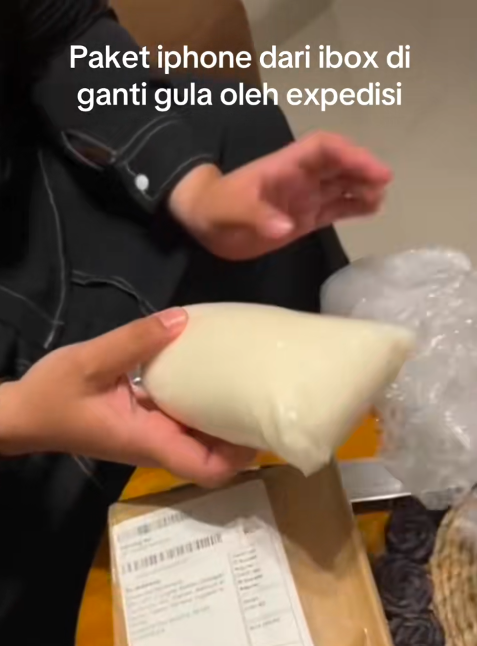 视频开头,她兴奋地用刀割开外包装盒,露出沉甸甸的泡沫塑料,但随着继续拆开,她的期待瞬间化为失望,因为梦寐以求的iPhone竟变成了一袋白糖。