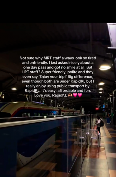 尽管对MRT职员的态度感到失望,但该名乘客仍肯定RapidKL整体的服务表现,并表示自己依然乐于使用该系统:“方便、便宜、又有趣。我爱你,RapidKL。”