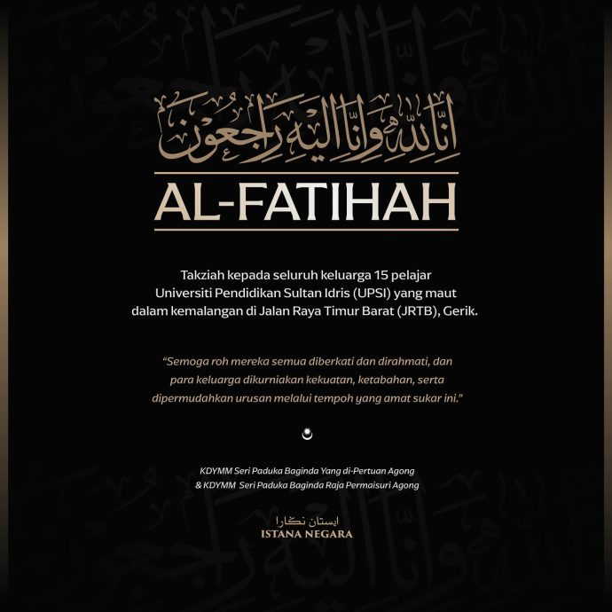 (吉隆坡9日讯)国家元首苏丹依布拉欣与元首后拉惹查丽苏菲雅,对今早在霹雳宜力——吉兰丹日里东西大道车祸中不幸丧命的15名苏丹依德利斯教育大学(UPSI)学生家属,致以深切哀悼。