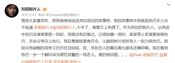 迪丽热巴10年前凭藉电视剧《克拉恋人》女配角“高雯”一角走红,她近日在综艺节目中吐露当年曾差点被换角,该剧制作人刘阳昨在微博揭露,当年剧已开拍一周,但幕后老板却想换掉迪丽热巴,后来是自己出面集结剧组力保迪丽热巴,直呼幕后的情况比剧本还精采。