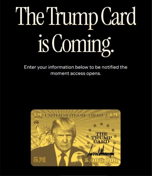 登入官网可见斗大标题写着“特朗普金卡到来”(The Trump Card is Coming, Trump Card也有王牌之意)。