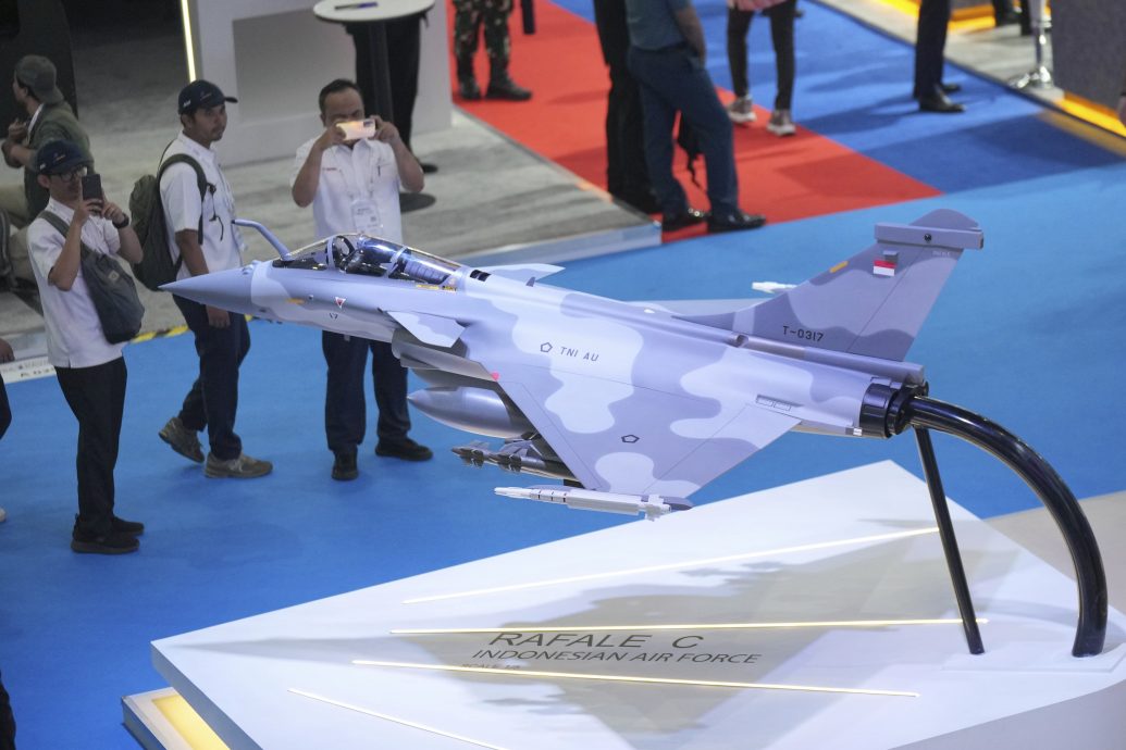防务展的参观者受现场展出的法国阵风战机复制品所吸引,纷纷拿起手机拍摄。(美联社照片)