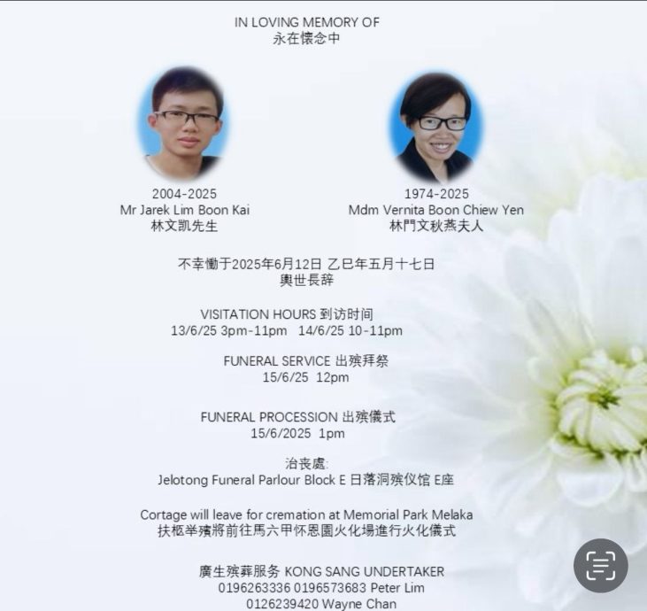 (马六甲13日讯)玛琳华小校长陈素贞今日代表该校行政处发布讣文,沉痛宣布敬爱的教师文秋燕女士及其儿子林文凯先生,不幸于近日离世。突如其来的噩耗,令人震惊与哀痛,全校上下同感哀悼。