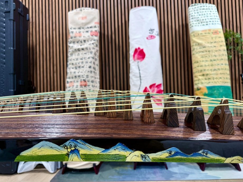 除却音色,古筝蕴含的故事,也成了他购买的缘由之一。“玉影长驻”和“敦煌佛缘”皆是古筝之父徐振高所监制的高端古筝,内部附有徐老亲笔书写的宣纸,意义非凡。情感丰沛的他,因被《千里江山图》的故事所触动,对金箔岩彩手绘浮雕的“小千里江山”爱不释手,而毅然在今年购入。