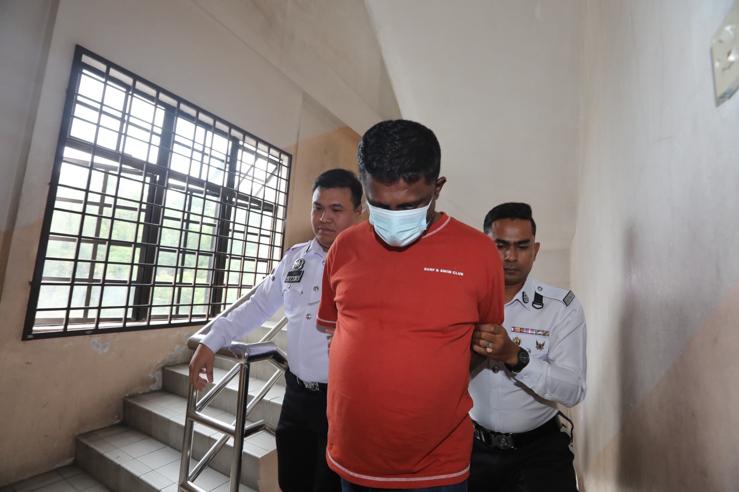 这名穿着橙色上衣的被告,于今早约8时20分被押抵新山法庭大厦,在进入扣留室前因见媒体拍摄情绪激动,不仅以粗口辱骂记者,还扬言要动粗,行为嚣张。