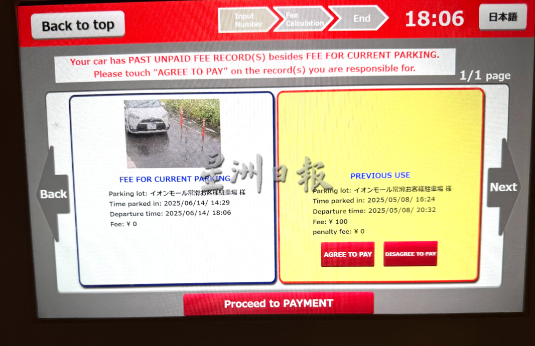 虽然在免费时限内离开,但临走前我们还是走进缴费机,检查是否要付停车费,结果屏幕一闪:“应付:100日元(约2.91令吉)。”