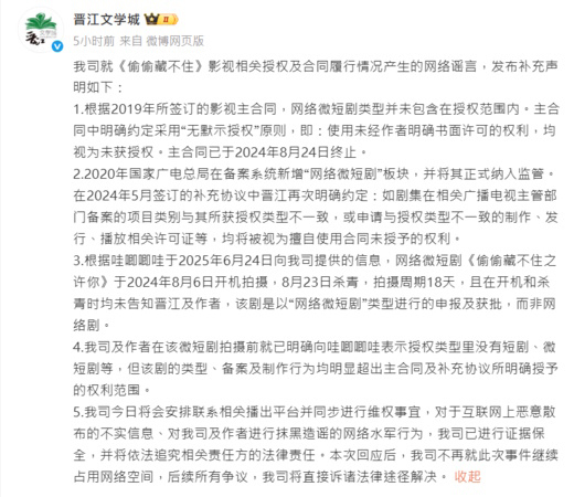 针对此次侵权的争议,晋江宣布已启动相关法律程序,并将联络相关播出平台下架内容。同时,对于网络上恶意散布不实信息及抹黑行为,晋江已进行搜证,并将依法追责,态度强硬。