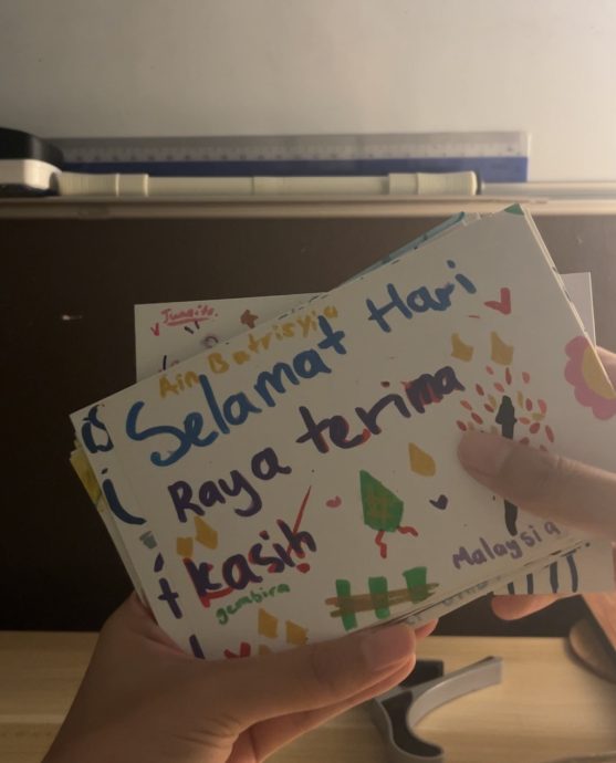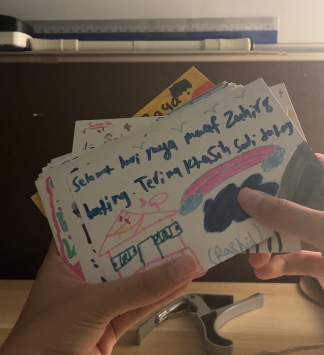 在筹备期间,心怡的姐姐偶然发现“Pertubuhan Badan Kebajikan Anak-anak Yatim Darussalam”这家孤儿院离家不会太远。于是,她们灵机一动,决定邀请院内的孩子在贺卡上绘画并写下节日祝福。这样的做法不仅能提升礼盒的销售量,也在购买者与孤儿之间建立起联结——孩子可以借此机会,向帮助他们的人亲自表达感谢。她们随即亲自走访孤儿院,邀请孩子参与贺卡创作。许多孩子写下“Selamat Hari Raya”、“Terima kasih”等话语。其中,让心怡很有印象的是孤儿在贺卡上写了一句:“Gembira”,“terima kasih sudi datang”,让她很感动和欣慰。她总共收集到25张贺卡,并将它们随同开斋节礼盒一起寄送给购买者。最后,她也将收益用于购买物资和礼物,捐给该孤儿院。