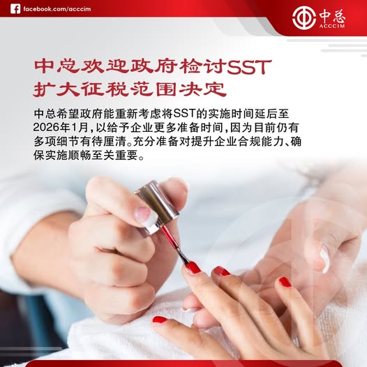 (吉隆坡28日讯)马来西亚中华总商会(中总)欢迎政府于6月27日发布的关于检讨销售与服务税(SST)扩大征税范围措施的决定,并希望政府能重新考虑将SST的实施时间延后至2026年1月,以给予企业更多准备时间,因为目前仍有多项细节有待厘清。