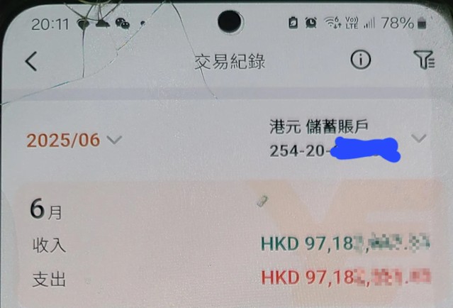 《8视界》引述港媒报道,该网民在Threads社交平台晒出银行账户截图,显示当月收入为9718万港元,支出亦为相同金额。他对账户为何突然入账如此巨款、随即又被取消感到不解。