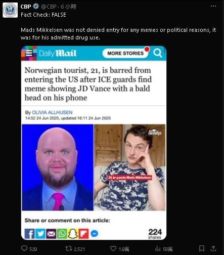 (伦敦29日综合电)一名挪威游客宣称,在入境美国时遭到了美国出入境管理部门的人员的“权力滥用和骚扰”,在发现他手机上存有一张美国副总统万斯的表情包后,直接拒绝他入境。这则新闻经英国《每日邮报》报道,引起关注,不过美国海关及边境保卫局(CBP)周二在X平台以“事实查核:假的!”为标题,否认当局因他手机有万斯表情包被拒入境。