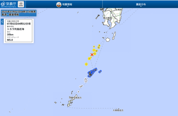根据气象厅统计,从当地时间6月21日至7月2日上午6时止,吐噶喇列岛周边已累计发生847次震度1以上的地震,其中包含数起震度5弱的强烈摇晃。此次地震发生后,短短1个半小时内又观测到4次有感地震,其中2次为震度2、2次为震度1,显示地震活动仍未趋缓。