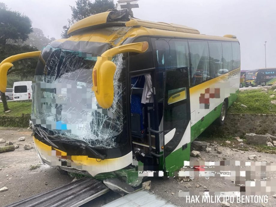 (文冬2日讯)云顶高原一辆旅游巴士撞击停车棚铁柱,导致铁棚坍塌压毁一辆停放的德士,所幸事件没有造成任何伤亡。