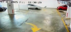 从停车场的闭路电视拍到的画面显示,一名男子正在停车场里推车,相信是轿车电箱没电,结果推到下斜坡时,整辆车往下冲,撞向女子的红色Myvi轿车。
