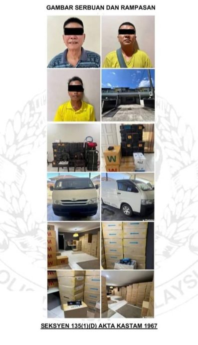 古晋取缔行动 警逮3男 起获逾千万令吉漏税烟酒