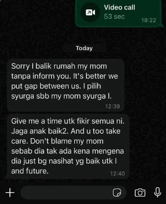 根据截图显示,该男子在WhatsApp上对妻子说:“很抱歉,我没有告诉你就回妈妈家了。我们最好保持距离。我选择天堂,因为我的妈妈就是我的天堂。