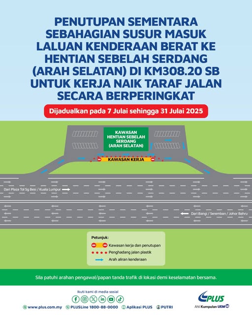 (吉隆坡7日讯)位于南北大道(PLUS)南向308.20公里处的沙登休息站,从今日起将分阶段对重型车辆关闭25天,以进行混凝土路面维修工程。