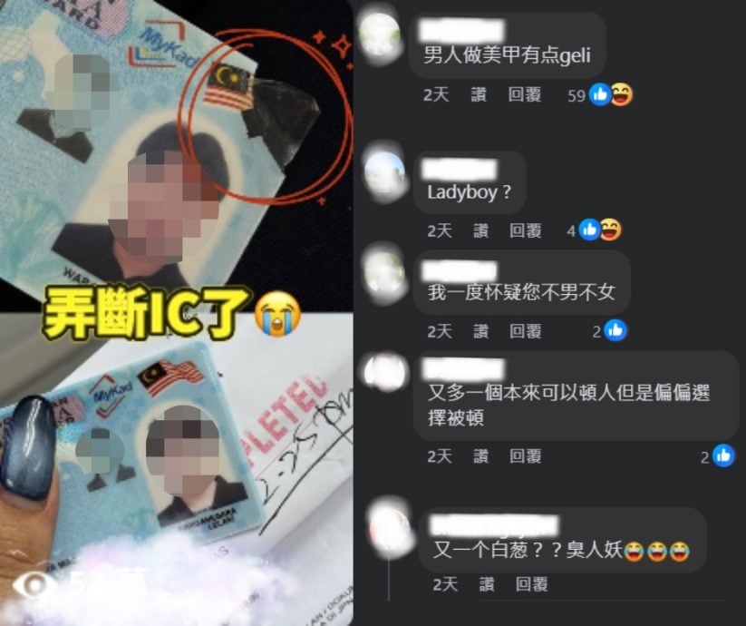 就在前几天,某位电台DJ上传一支在新山城市转型中心(UTC)快速补办身分证的短视频,内容提到补办流程和注意事项,并称赞相关单位的办事效率。结果,许多网民却将焦点放在他的美甲上,留言尖酸刻薄,让人不忍心看下去。