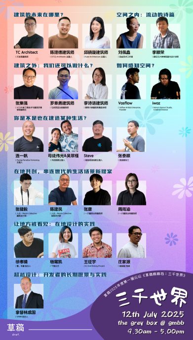 由REKAN STUDIO主导的《草稿》中文建筑媒体将于2025年7月12日(星期六)上午9点30至下午5点于吉隆坡武吉免登的GMBB GreyBox举办第一届草稿中文论坛《草稿嘛嘛档:三千世界》,与喜爱建筑的朋友一起讨论建筑的多种可能及未来的发展。