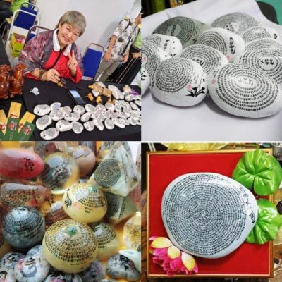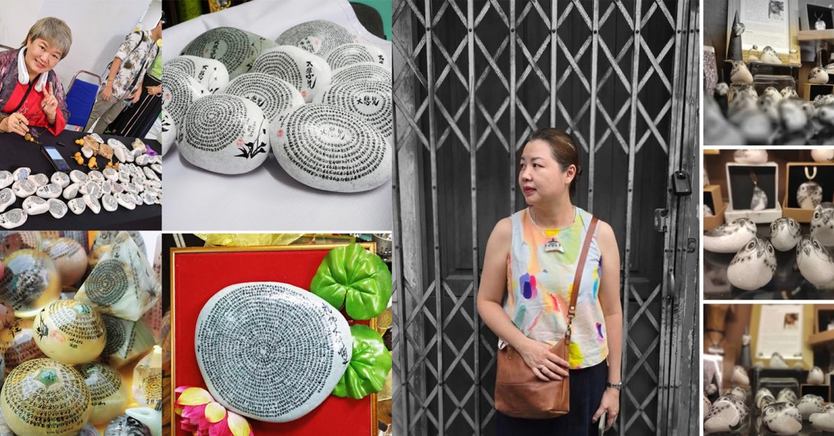 黄女士二十年来不断的,自掏腰包买石头,在石头书写各类佛教经文,并自费到全国各地现场制作以推广义卖,所得悉数捐献各慈善团体,甚是难得。黄女士的石头书法,绝大部分以佛教心经为主要内容,偶尔会写一些较多字的经文如大悲咒、阿弥陀佛经等。据说这些年来,黄女士义卖石头所筹得的义款,经已累积达数十万令吉之多,令人敬佩不已。