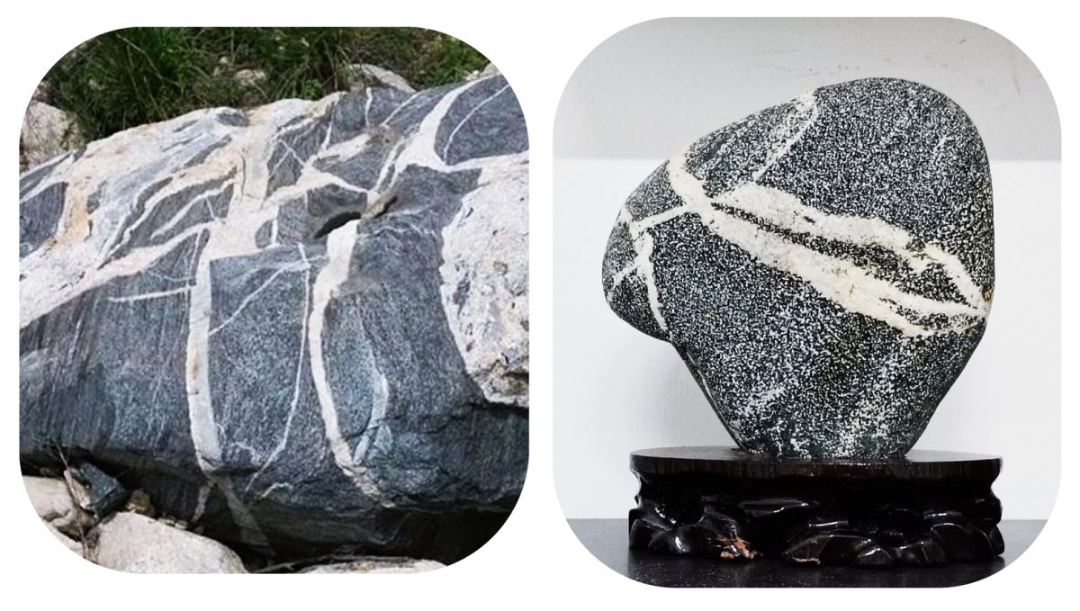 锦华兄送我的泰山石质地坚硬,结构细密,其结晶颗粒粗,块体形态浑圆自然,古朴墩厚,像不规则显示有图纹的深灰色鹅卵石头。该石头外表看起来基调沉稳、凝重、浑厚,白色纹理在深灰色的石身上更显渗透感。泰山石有着多种不同的象征意义,除了是一颗天然脱俗的家居摆设之外,它还具有力量、稳重、永恒、坚韧不拔的寓意存在。