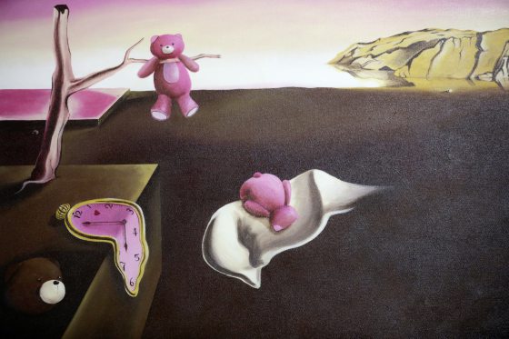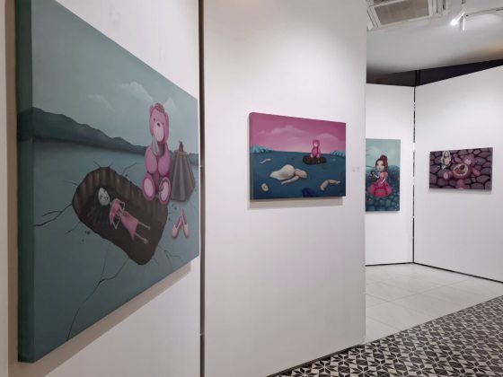 在作品中,她运用泰迪熊、粉色蝴蝶结和小女孩等梦幻元素,展现童年到成年的迷茫与现实社会的荒谬,让人们重新审视对事物的期望与现实之间的落差。