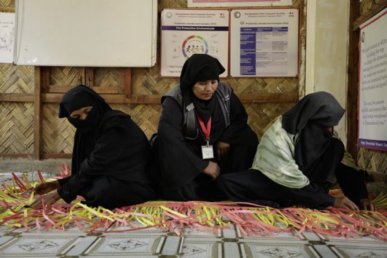 索基娜用颤抖却充满自信的手指编织着渔网。这是她最近在孟加拉红新月会(Bangladesh Red Crescent Society, BDRCS)举办的一项生活技能培训项目中学到的,该项目得到了红十字会与红新月会国际联合会(International Federation of Red Cross and Red Crescent Societies, IFRC)的支持。她积极地在营地里的菜市场出售自己制作的渔网。
