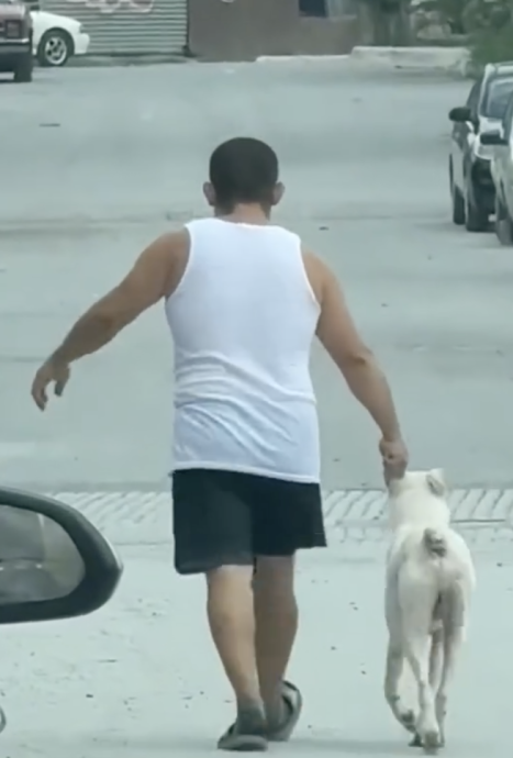 视频可见狗狗没有挣扎,也没有反抗,只是默默快步配合,乖乖跟在男子身边。