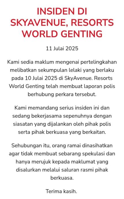 云顶世界今日发文告指出,认真看待此事件,也已向警方投报,并会给予警方合力配合以进行调查。与此同时,也促请民众不要胡乱散播不实谣言。
