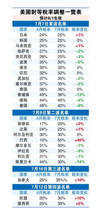 综合美联社报道,在上周六,特朗普宣布第四波关税名单,对美国其中两个最大的贸易征收30%关税,8月1日生效。
