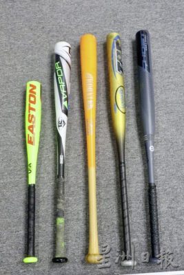 球棒因年龄层级会有差异,左起为儿童版、合金制(通常为U18选手使用)、木制(公开组选手使用),右一右二为垒球球棒。