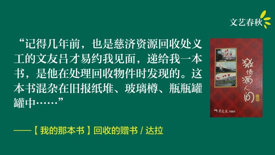记得几年前,也是慈济资源回收处义工的文友吕才易约我见面,递给我一本书,是他在处理回收物件时发现的。这本书混杂在旧报纸堆、玻璃樽、瓶瓶罐罐中,他心血来潮,一时眼尖,忽然察觉,说“现在奉上,完璧归赵,物归原主。”他开玩笑毕恭毕敬地双手捧着一本书弯腰作揖,夸张的表情让我啼笑皆非。