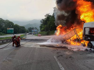 (八打灵再也16日讯)一辆载着露营装备的罗里在行驶中突然起火,消防及拯救人员赶到现场时,罗里已被大火吞噬,毁不成形。