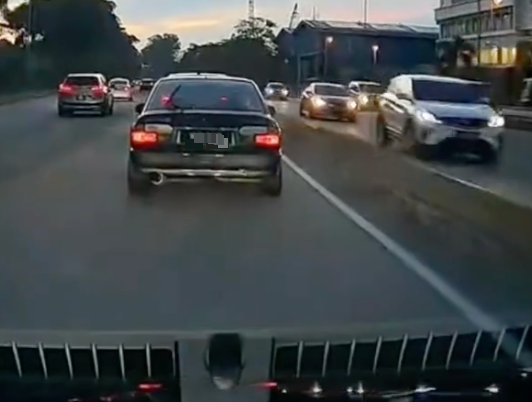 (八打灵再也16讯)一辆轿车疑似蓄意撞倒摩托车骑士后逃逸,目击一切的男子临危不乱,驾车紧追约1分钟成功拍下肇事者车牌号码,其果断行为被大赞“公路英雄”!
