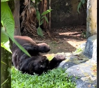 “Apoh”的黑豹,在围栏草地上慵懒翻滚,悠哉闲哉。